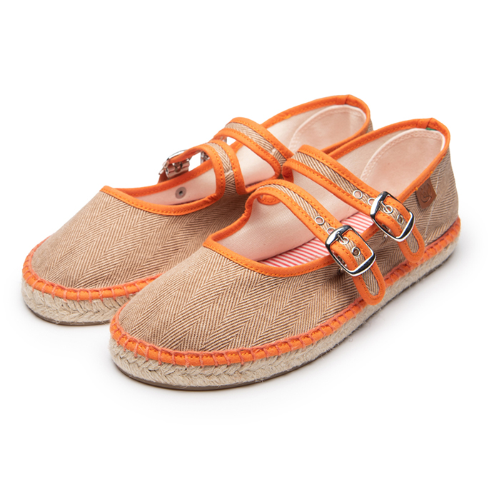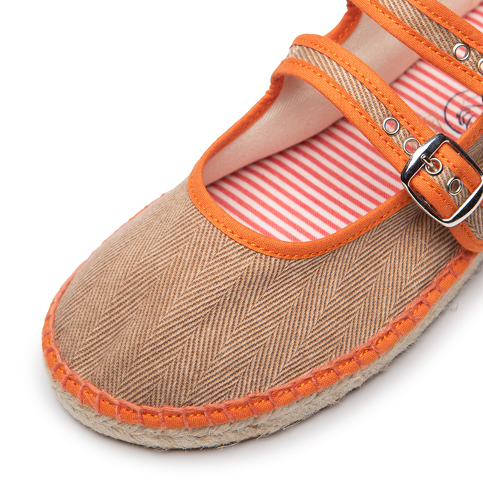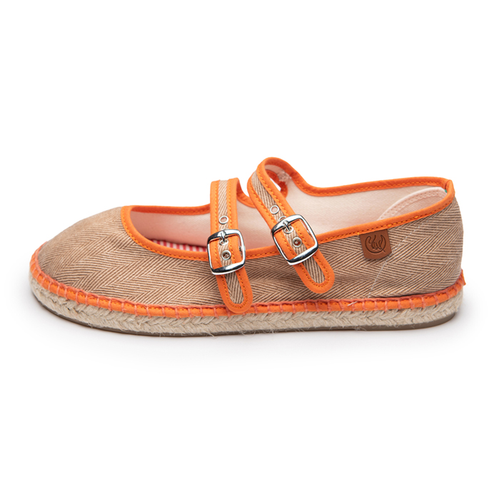 Ada es nuestra alpargata barefoot. Esta fabricada en algodón lavado con relieve de espiga en color cuero y ribete a contraste naranja. Esta alpargata lleva una doble plantilla acolchada con tejido a rayitas que da una frescura especial y que nos acompañará durante estos cálidos días de primavera.
