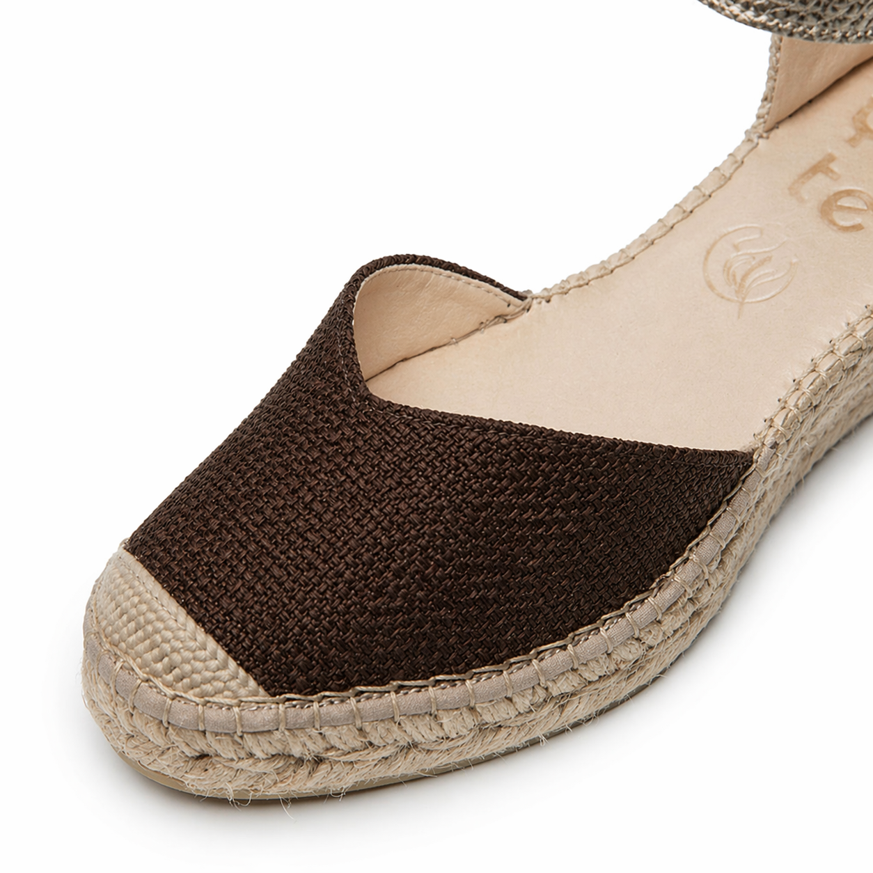 Paula es una valenciana de escote corazón, cerrada, fabricada en tejido de algodón color marrón, con el interior forrado que se sujeta al tobillo mediante una pulsera lo que da una mayor sujeción a la hora de caminar en nuestro día a día.