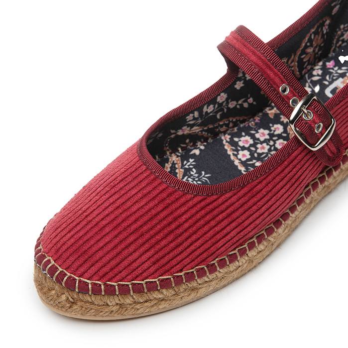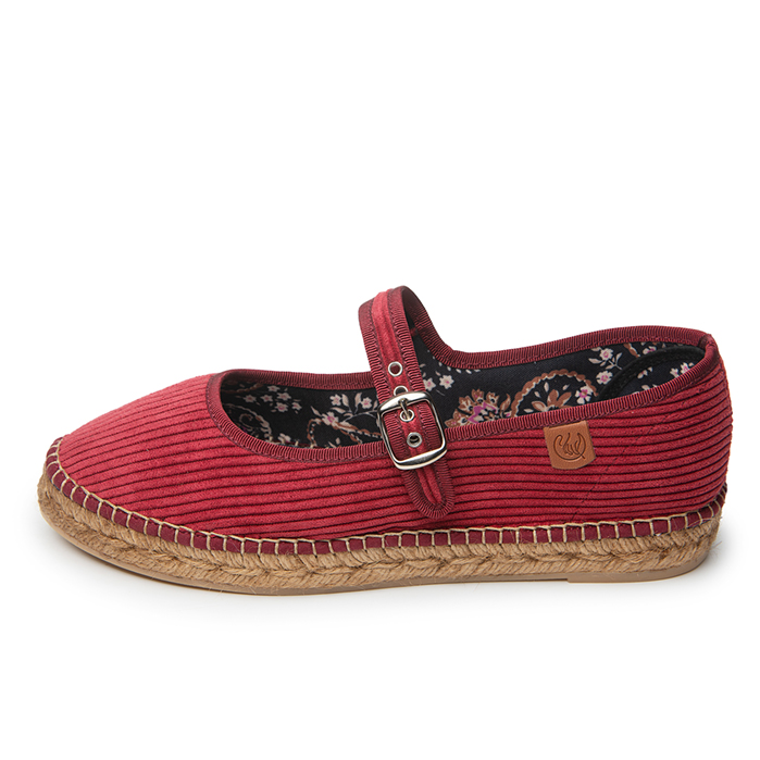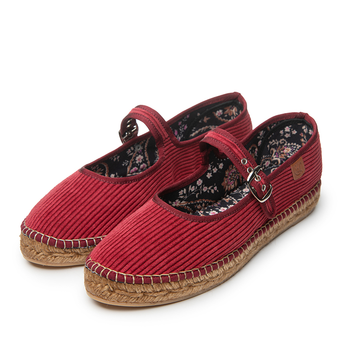 Alba es nuestra Mary Janes de pana aterciopelada burdeos y con ribete al tono. Un modelo muy cómodo, especial para llevar en otoño/invierno por su suela tintada y tratada con una nueva técnica repelente del agua. Esta alpargata se sujeta con pulsera y hebilla libre de níquel, lleva doble plantilla acolchada con tejido estampado que da una calidez especial.
