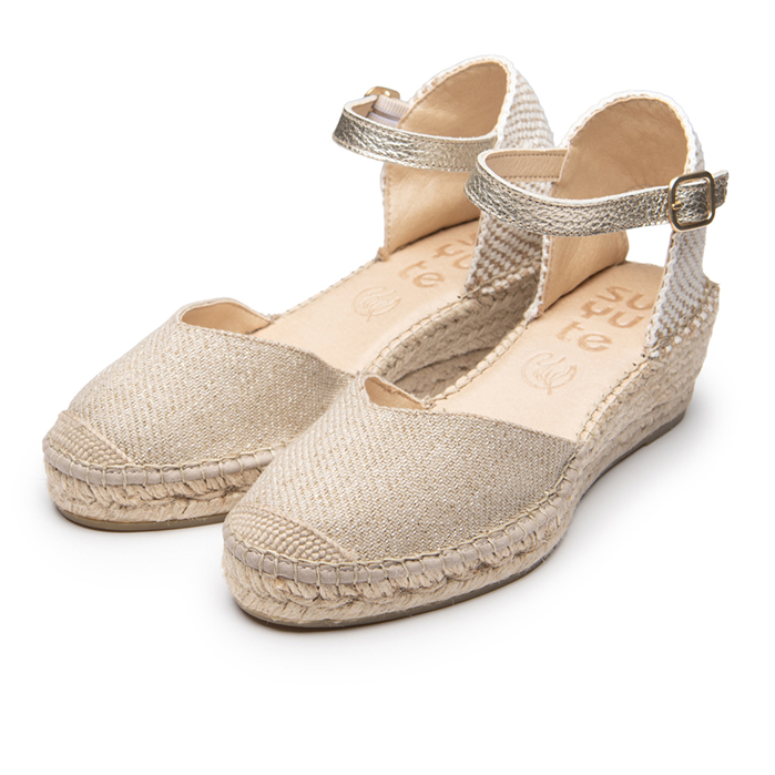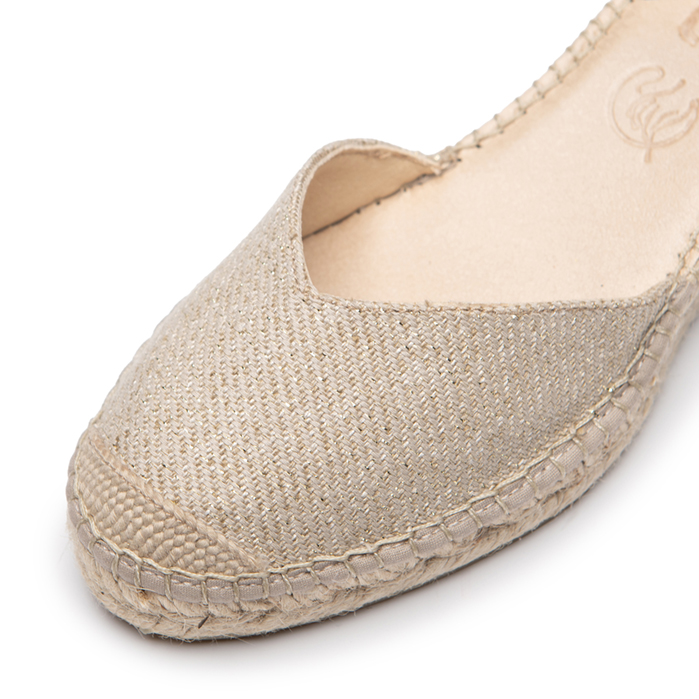 Paula esta fabricada en tejido de algodón color natural con hilos en brillo oro y con su interior forrado. Esta alpargata se sujeta al tobillo mediante una pulsera lo que da una mayor sujeción a la hora de caminar en nuestro día a día.