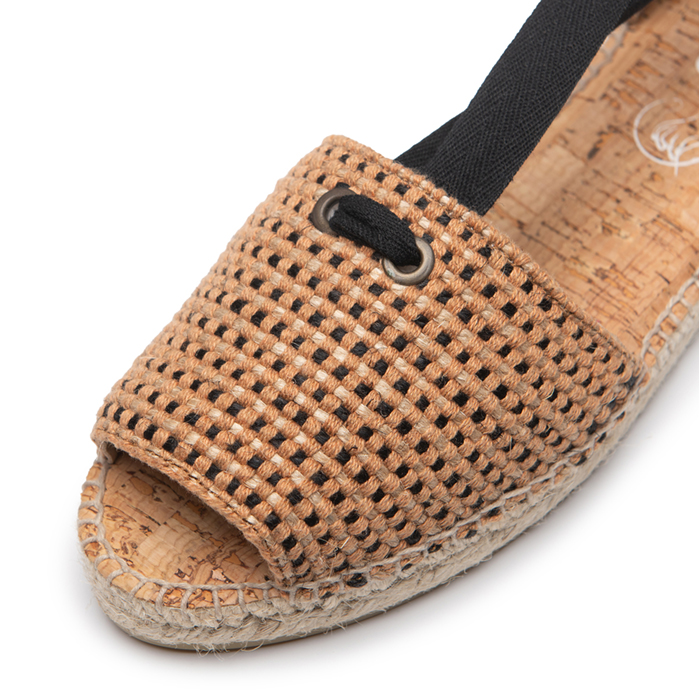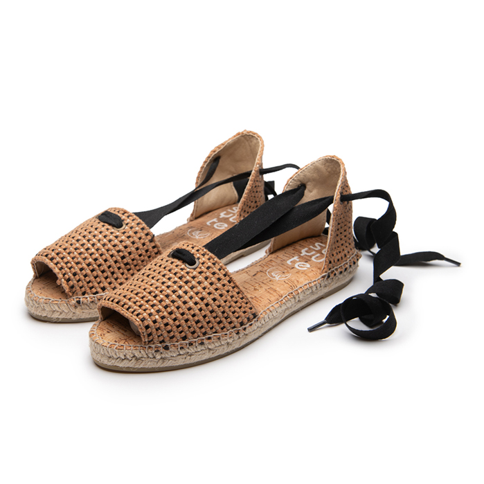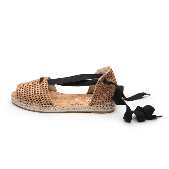 Lolita es nuestra sandalia artesanal fabricada en algodón en color tostado pero con detalles en negro y con cintas negras para atar al tobillo, un sencillo ajuste que te dará la comodidad necesaria para pasar todo el día con un calzado ligero y fresquito.