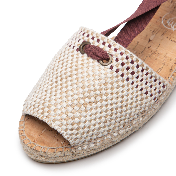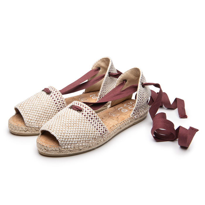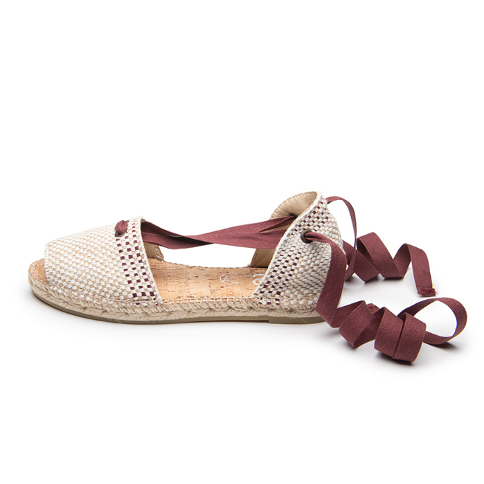 Lolita es nuestra sandalia artesanal fabricada en algodón en color crudo pero con detalles en burdeos y con cintas burdeas para atar al tobillo, un sencillo ajuste que te dará la comodidad necesaria para pasar todo el día con un calzado ligero y fresquito.