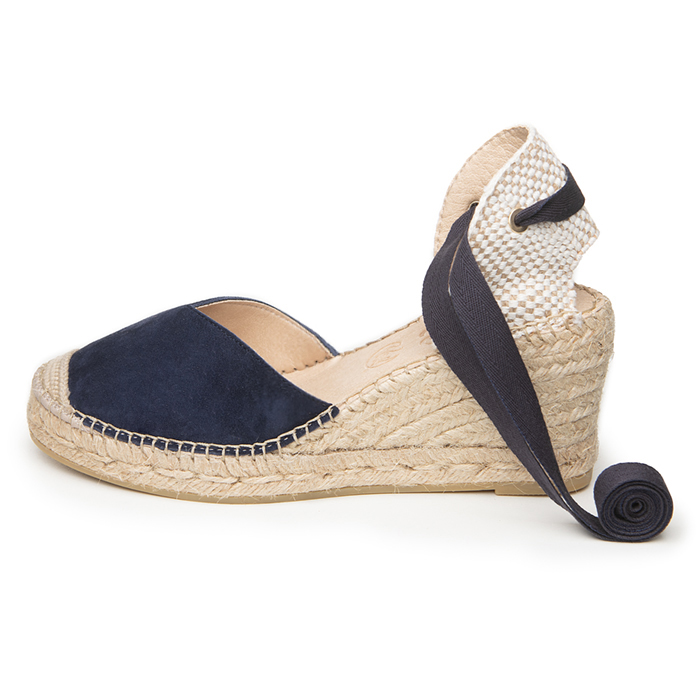Loreto esta fabricada en piel ante de color marino, con el interior forrado y se sujeta al tobillo mediante una pulsera en ante marino que dan una mayor sujeción a la hora de usarlas en nuestro día a día